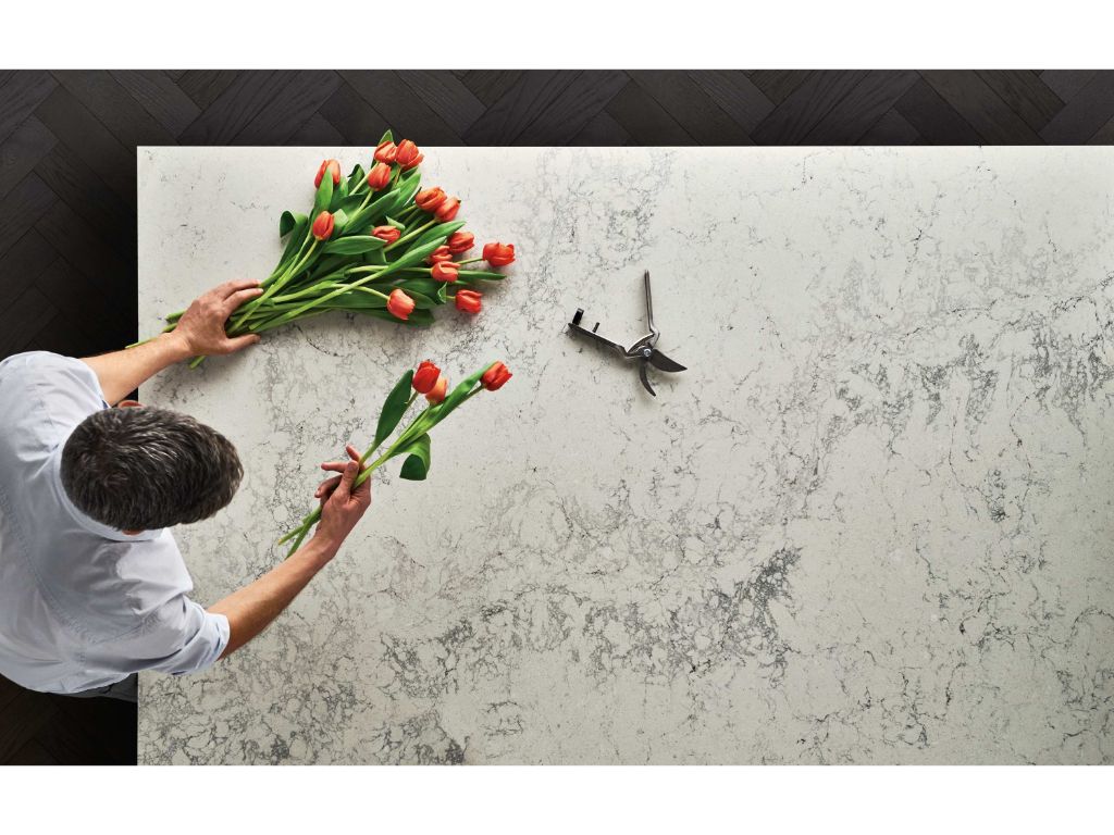 Alpine Mist av Caesarstone ur Andrews Granites sortiment är en kvartssort som har en ljusgrå grundnyans med vita ådringar – den kan pryda alla sorters rum.