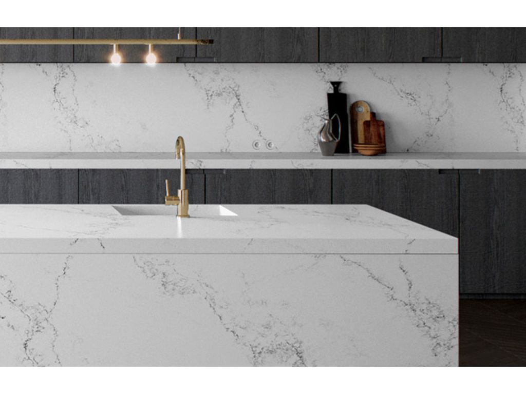 Crystal Calacatta Amnis är en ljus kvartssort av Technistone som har kraftiga mörka ådringar. Därmed skapas en elegant marmorlik textur.