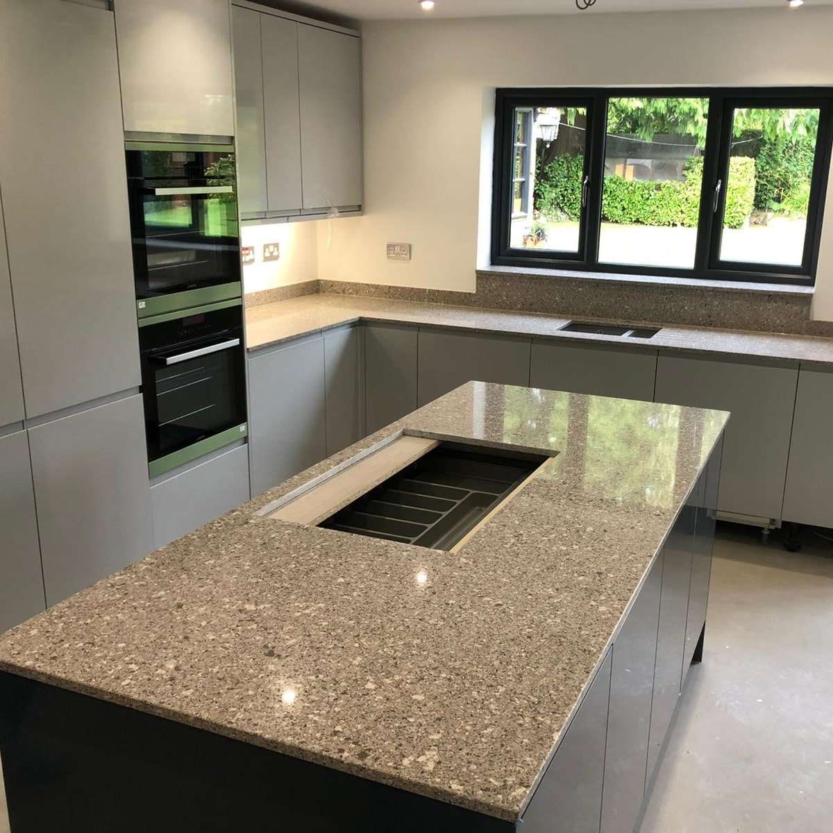 Också tillgänglig i 40 mm tjocklek (limmad kant), där den limmade kanten ger utseendet av en tjock 40 mm skiva men använder det effektiva och lätta 20 mm materialet.