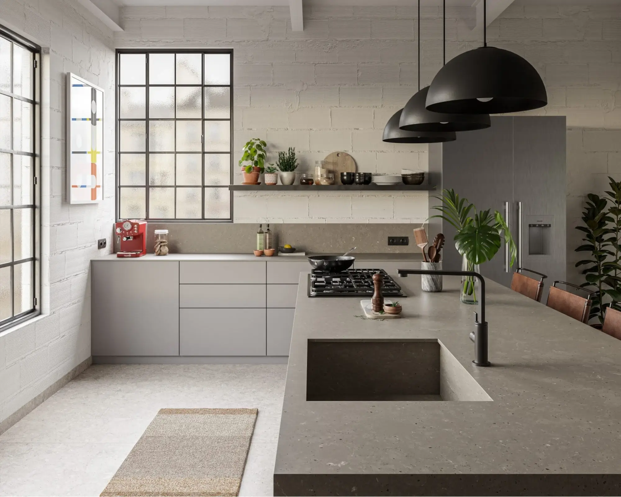 Concrete Pulse från Silestone är en elegant kvartsyta som återskapar den industriella känslan av rå betong. Den matta grå tonen ger ett modernt uttryck till kök och badrum.