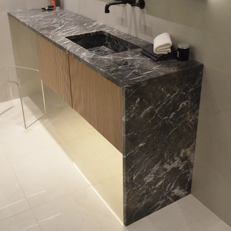 Grigio Carnico kan användas förutom för bänkskivor i köket och badrummet även utomhusmiljöer, där den kommer få en naturlig textur genom att påverkas av vädret.
