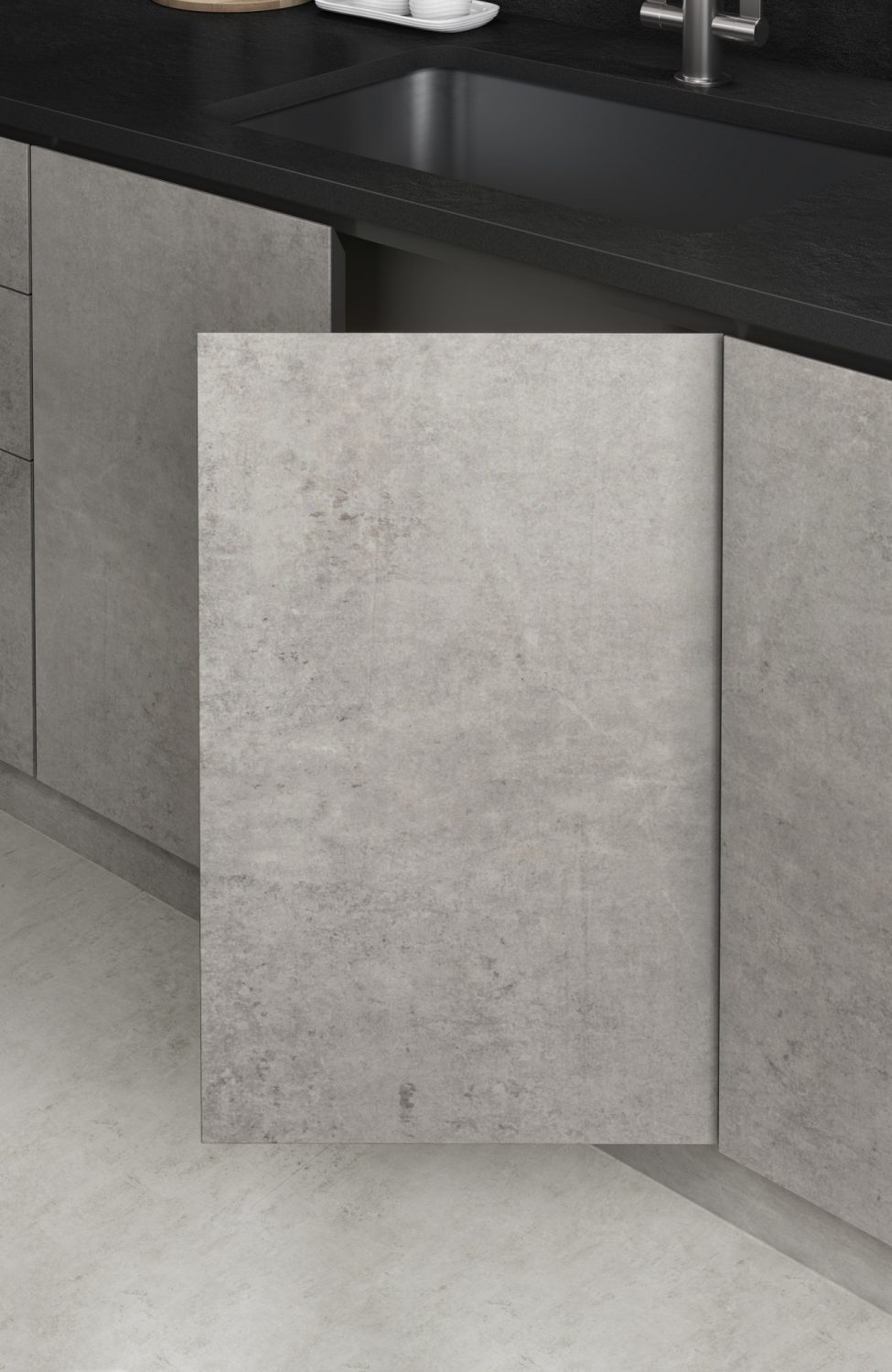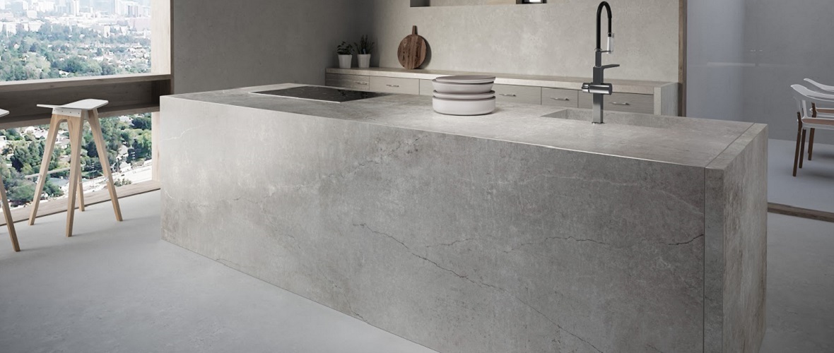 Kreta från Dekton är inspirerad av industriell betong och erbjuder släta grå toner med subtil textur.