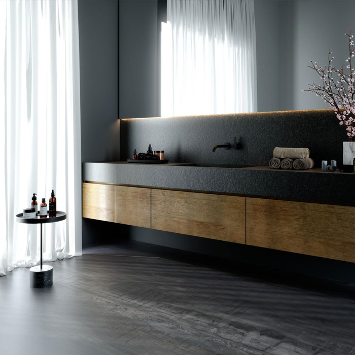 Den matta finishen tillför sofistikering till dess slående utseende och gör den idealisk för moderna eller industriella kök och badrum. Granito Black är mångsidig och passar bra ihop med en mängd olika designelement, från slanka metallbeslag till rik träinredning.