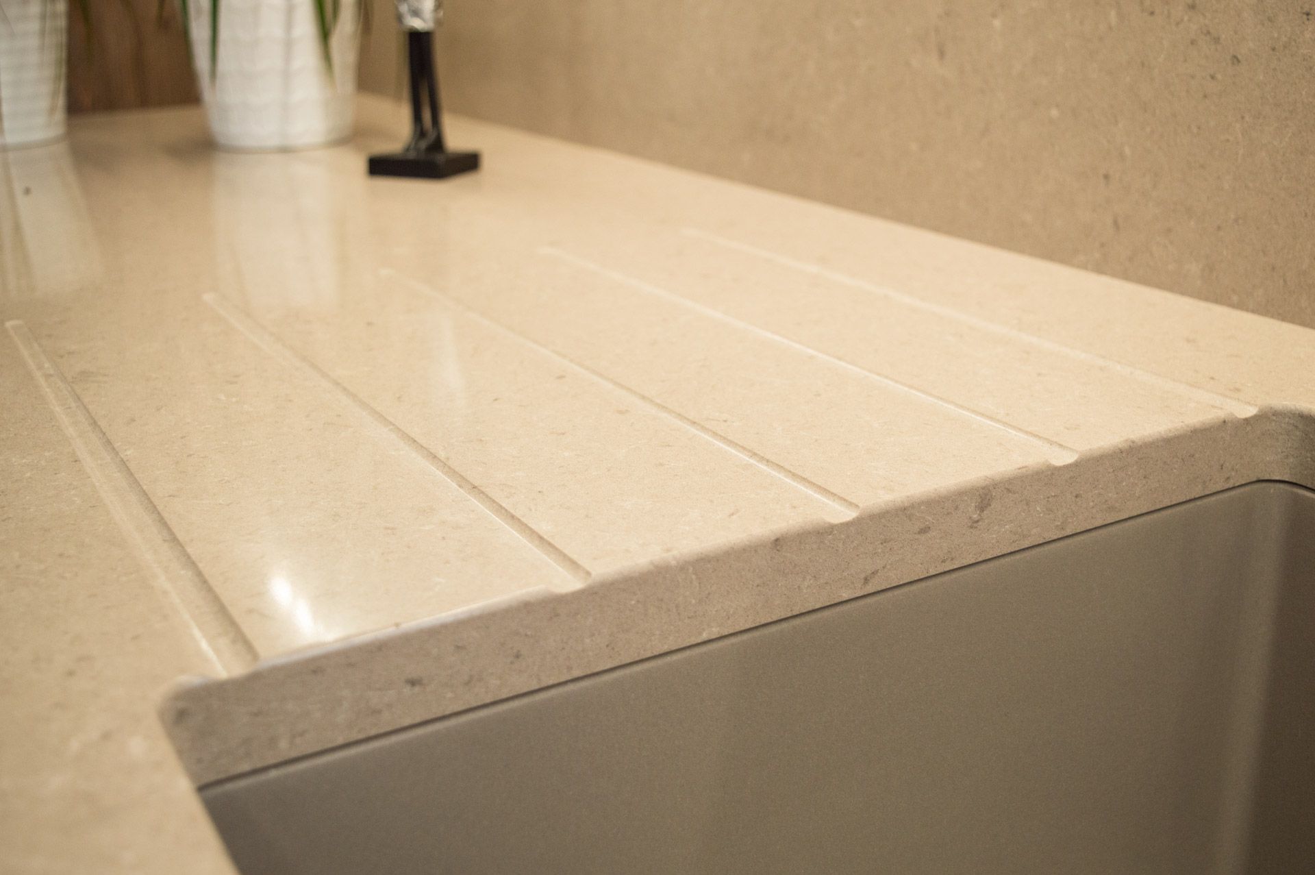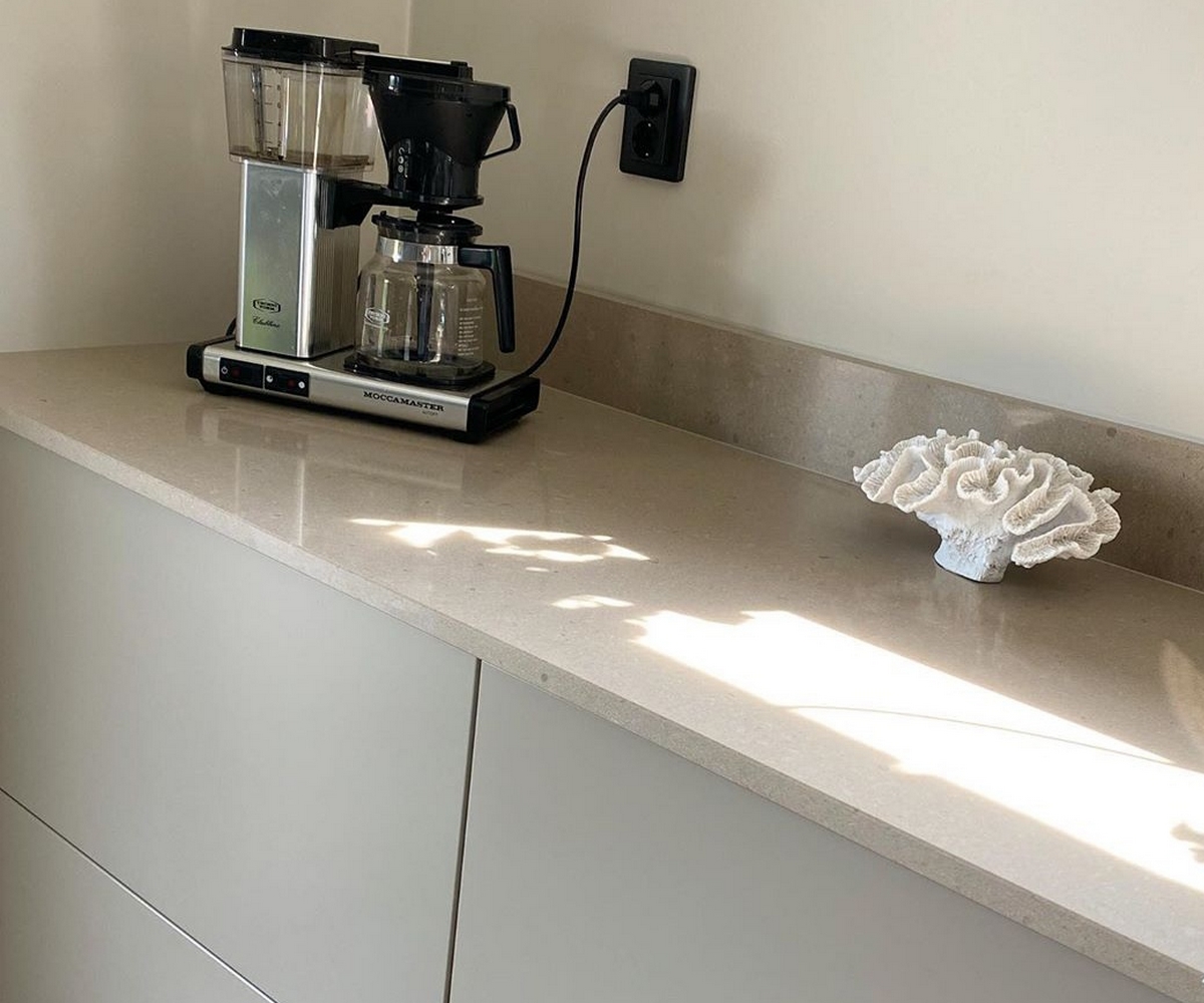 Technistone Noble Troya har en rik blandning av mjuka beige och grå toner, genomsyrad av subtila ådringar som skapar en elegant och förfinad estetik.