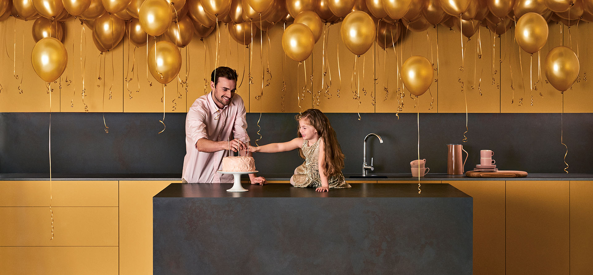 Oxidian av Caesarstone ur Andrews Granites sortiment är en rik kombination av svart kvarts som präglas av rostfärgade mönster över hela bänkskivan.
