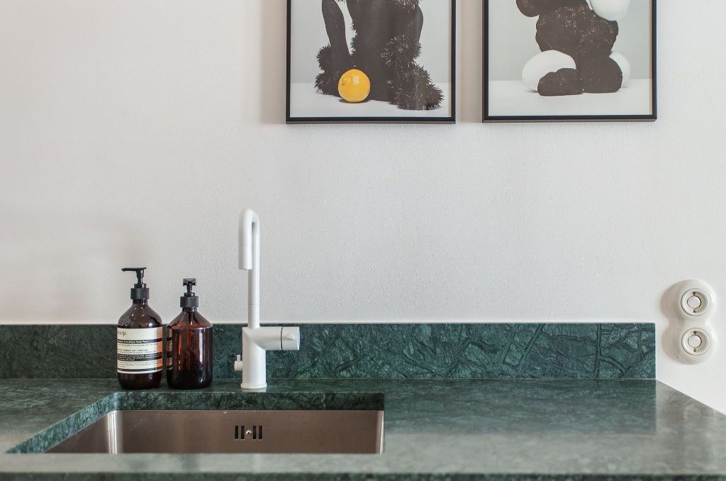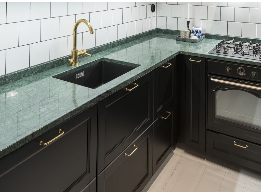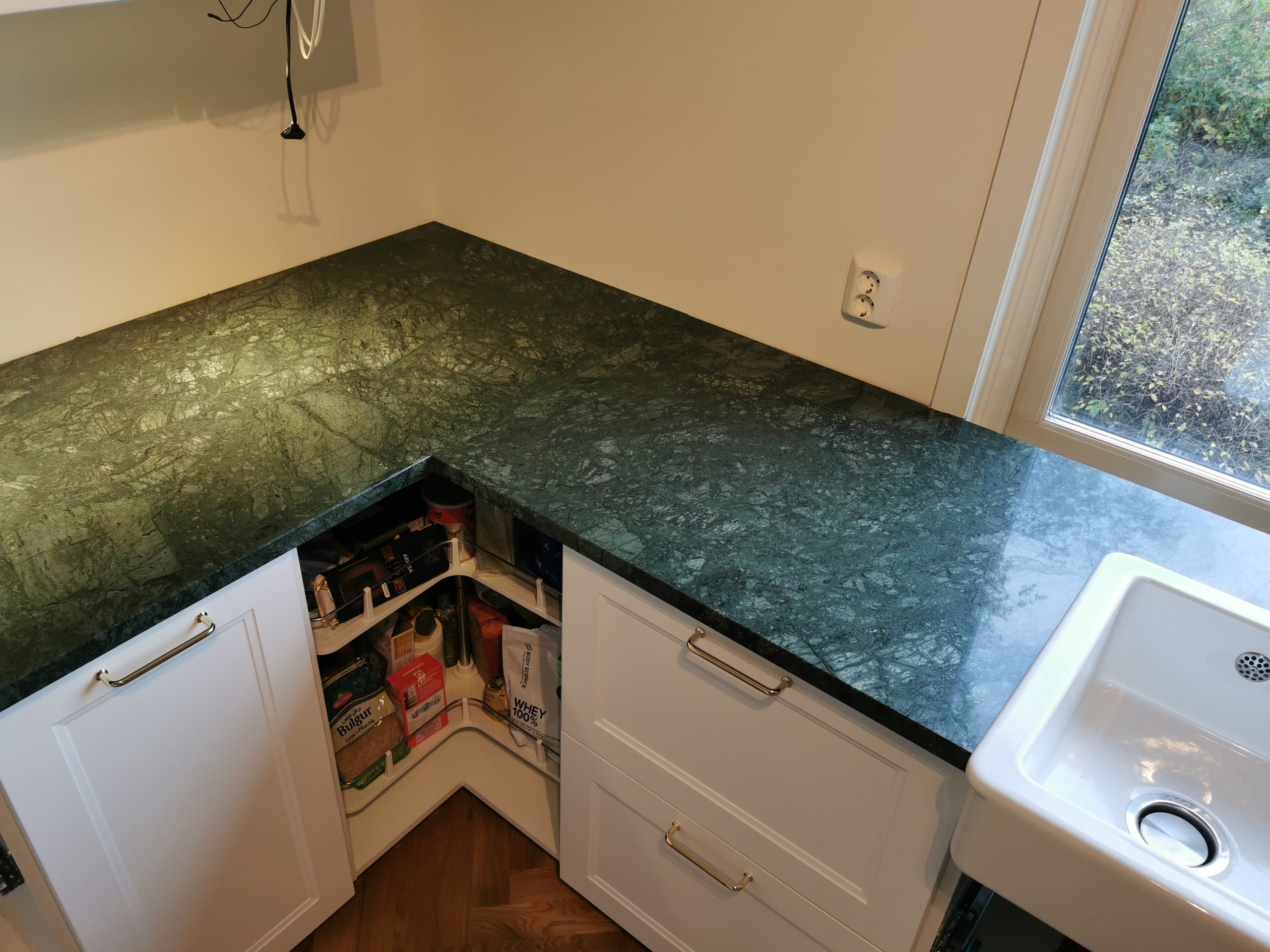 Mörkare marmorsorter är extremt vackra naturliga stenslag, men de är mindre lämpliga för kök där användningsintensiteten är hög. De är stenar som är känsliga för fläckar och repor och är snarare en vacker dekoration än en praktiskt funktionell yta.